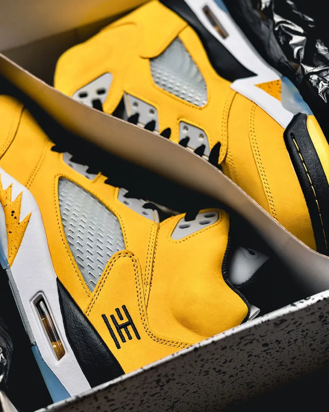 The product is a brand new pair of Air Jordan 5 Retro Tokyo 2025 in size 11.5, featuring a yellow color scheme with a multi-color design. These athletic sneakers are part of the Air Jordan product line and are designed for men. The upper material is suede, giving the shoe a luxurious feel. The style code is IO3372-700, and the release date is September 28, 2025. Perfect for sneaker enthusiasts looking for a stylish and high-quality pair of Air Jordan shoes.