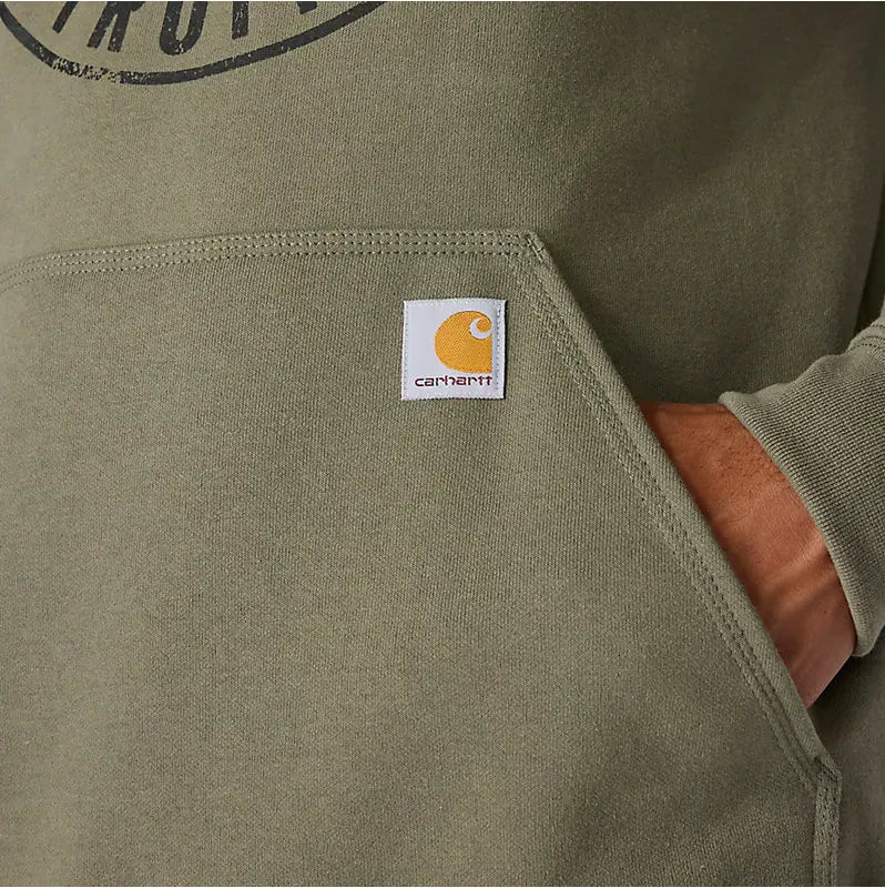 The Carhartt Detroit Sweatshirt is a men's small green hoodie made from a loose-fitting fleece fabric. Featuring a pullover style with a hood, this midweight sweatshirt is accented with a logo and camo design, making it suitable for various outdoor activities like hunting and cross-training. With its solid pattern and long sleeves, this Carhartt sweatshirt is machine washable and perfect for all seasons. Ideal for those looking for quality workwear with a touch of American heritage.